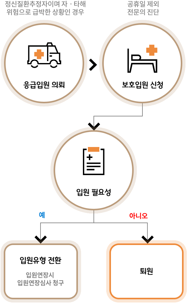 정신질환자로 추정되는 자·타해 위험이 큰 사람을 발견한 사람은 의사·경찰관의 동의를 받아 해당 정신질환추정자를 정신의료기관에 입원을 의뢰할 수 있습니다. 이 경우 3일 이내에 다른 유형의 입원으로 전환하거나 퇴원시켜야 합니다.