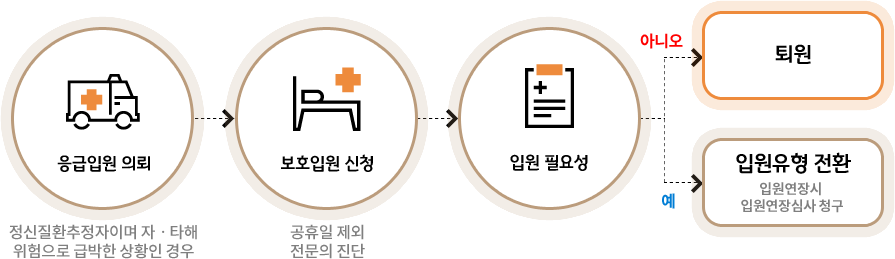 정신질환자로 추정되는 자·타해 위험이 큰 사람을 발견한 사람은 의사·경찰관의 동의를 받아 해당 정신질환추정자를 정신의료기관에 입원을 의뢰할 수 있습니다. 이 경우 3일 이내에 다른 유형의 입원으로 전환하거나 퇴원시켜야 합니다.